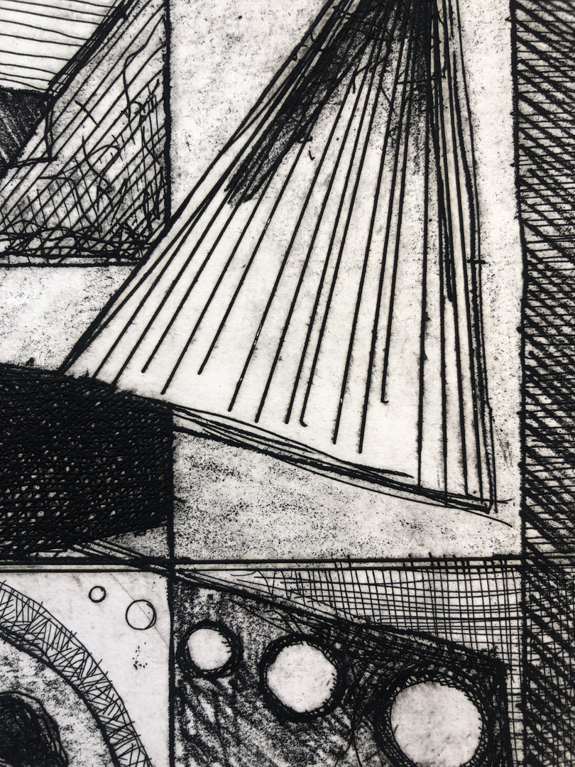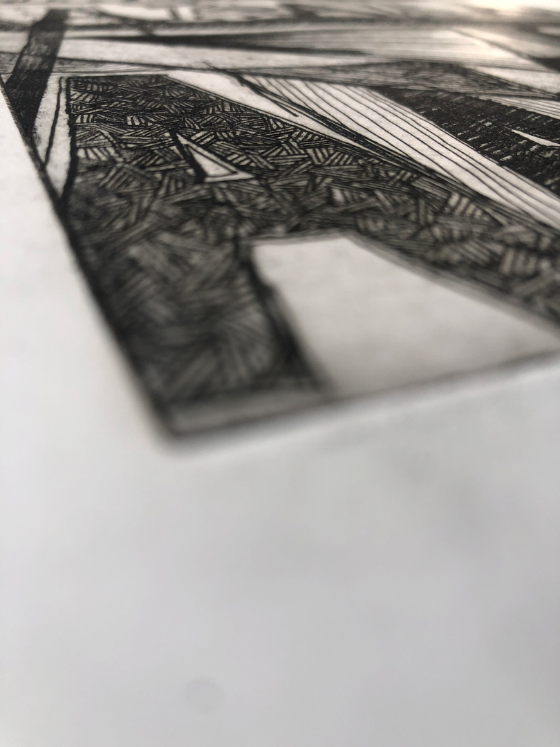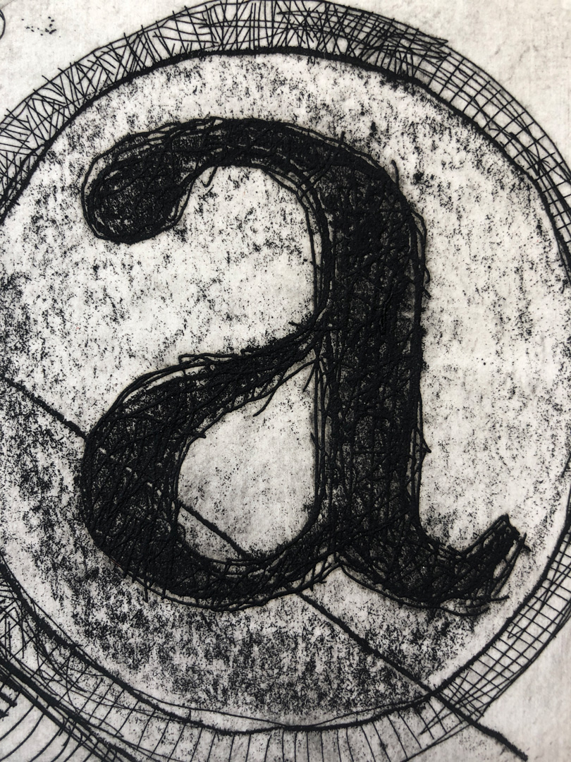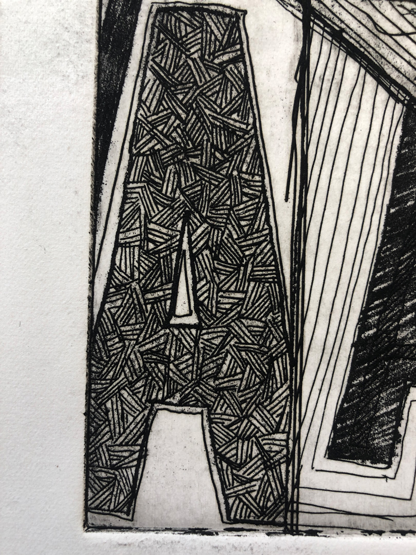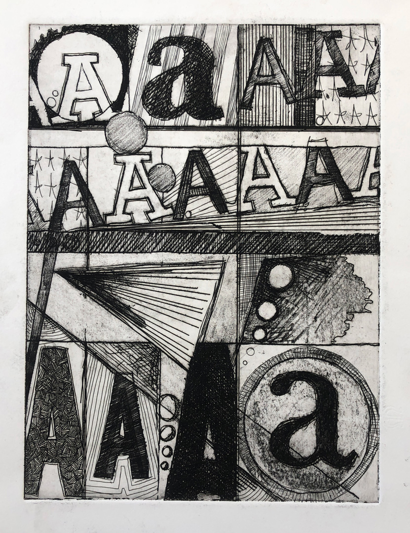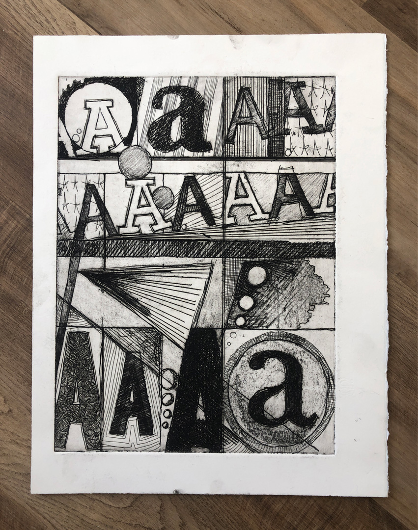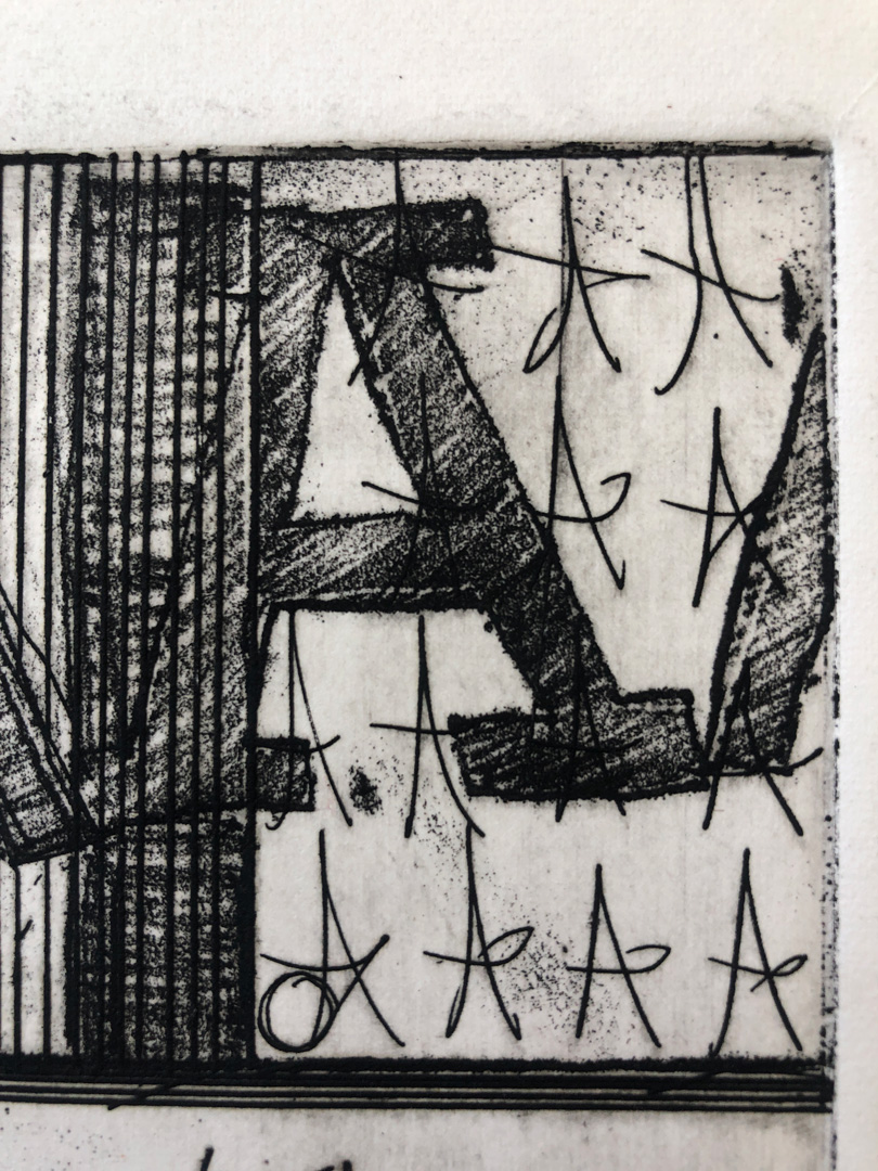 This an Artist Proof (A.P.), a one-of-a-kind print made from the piece titled ‘A Study’, an intaglio etching by AnnMarie Flamenco, circa 2005. Here I was exploring the letterform “A” by hand-etching on a steel plate to create an abstract typographic piece.