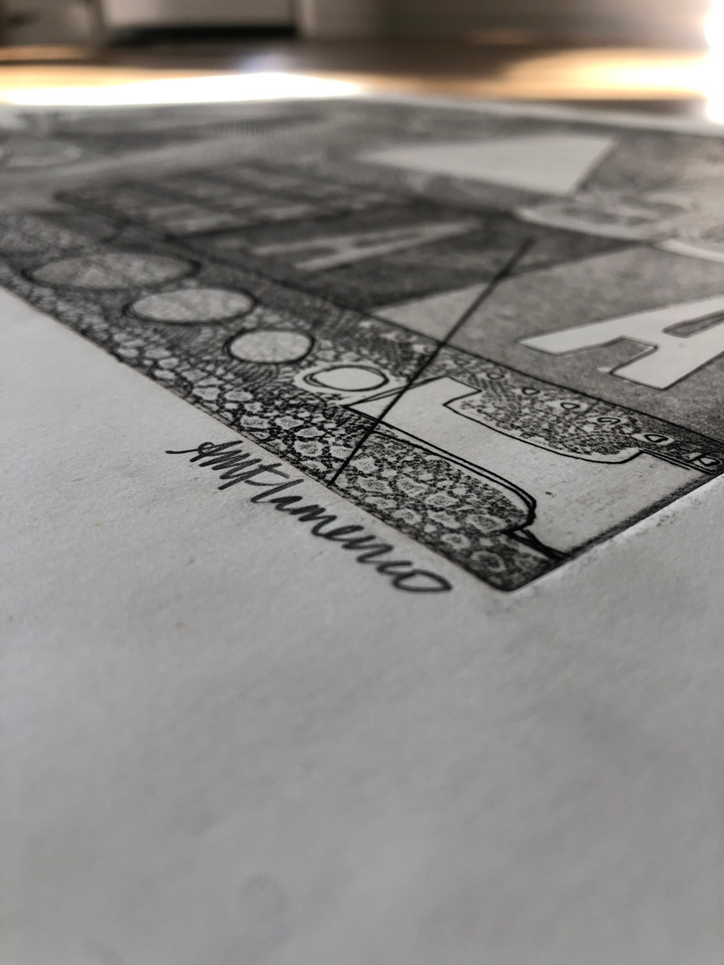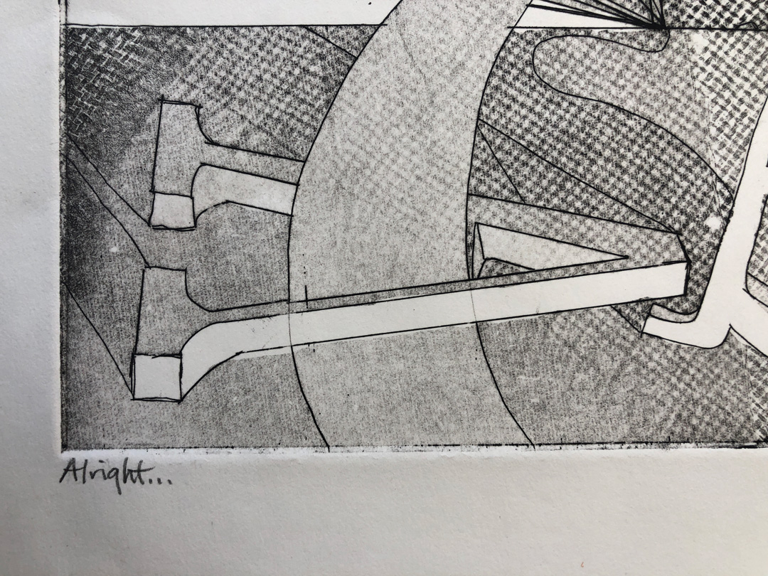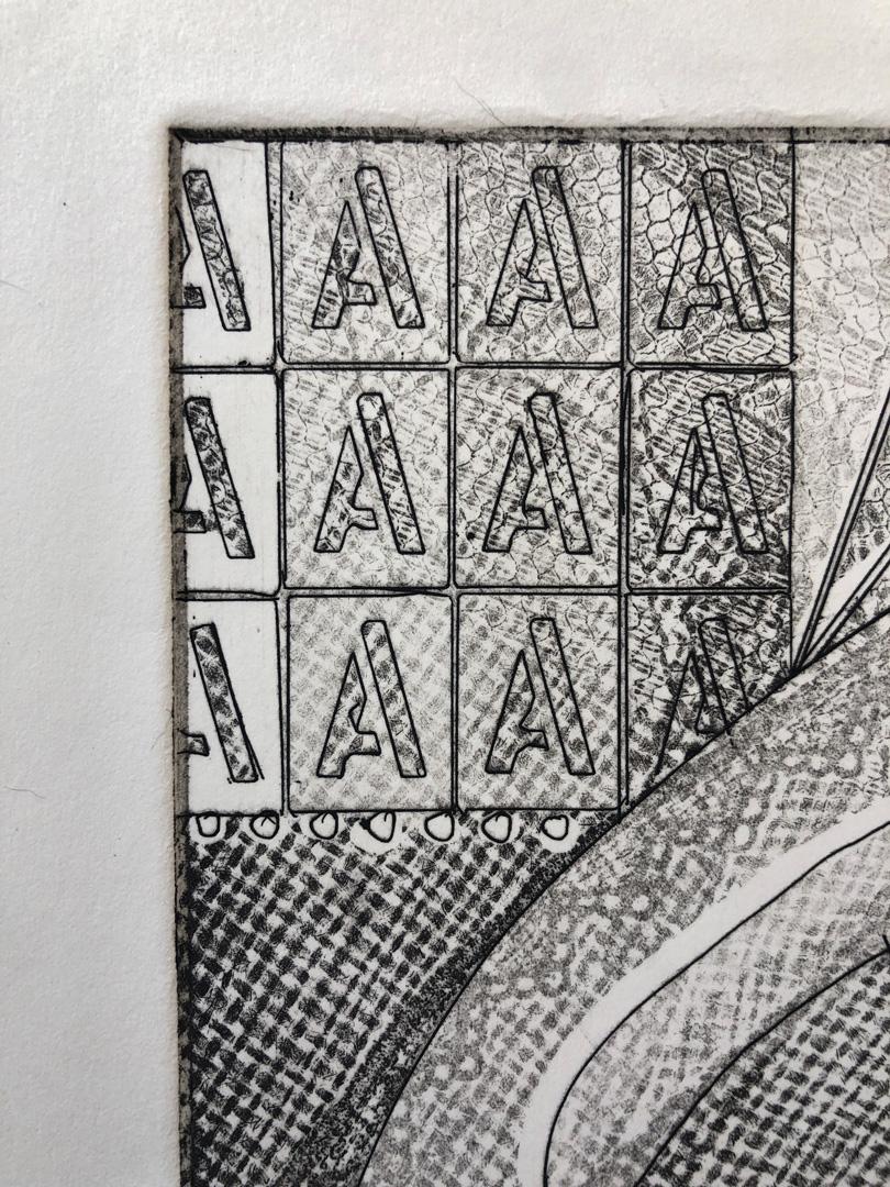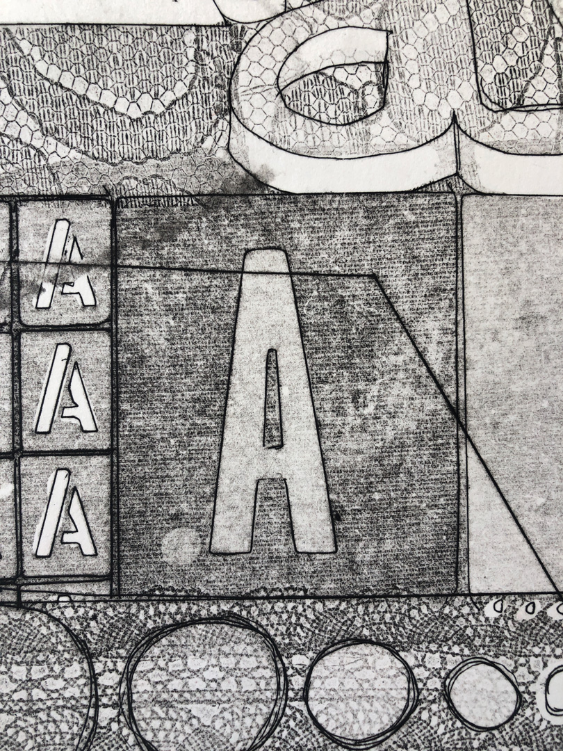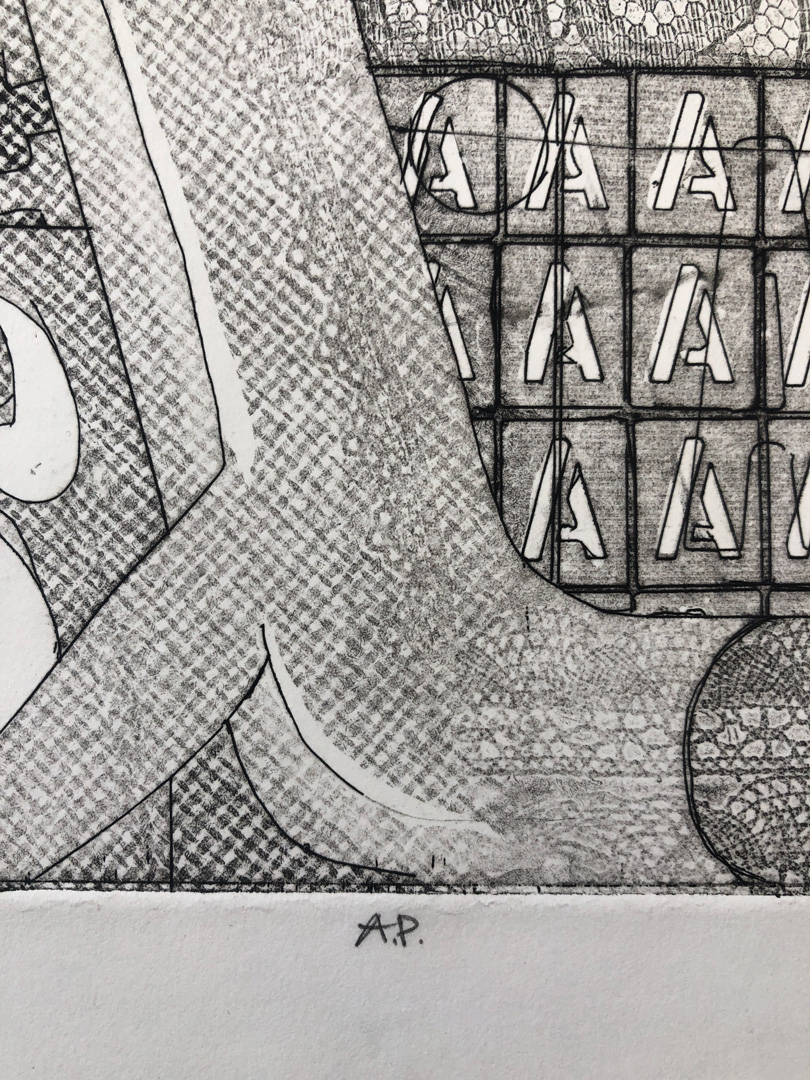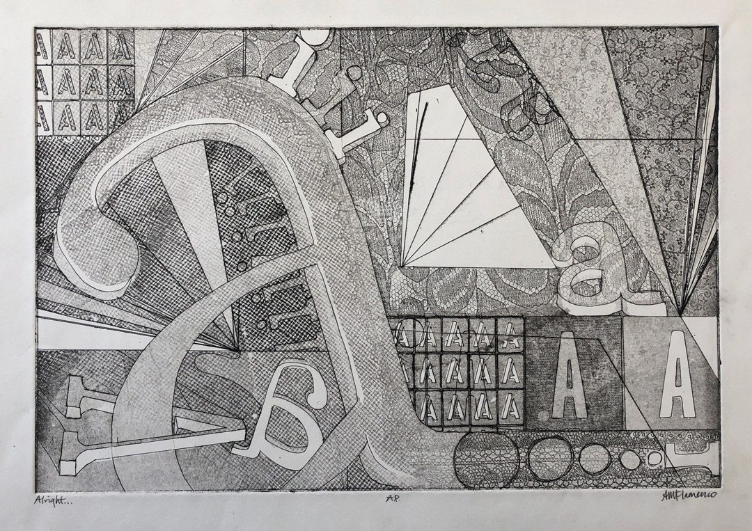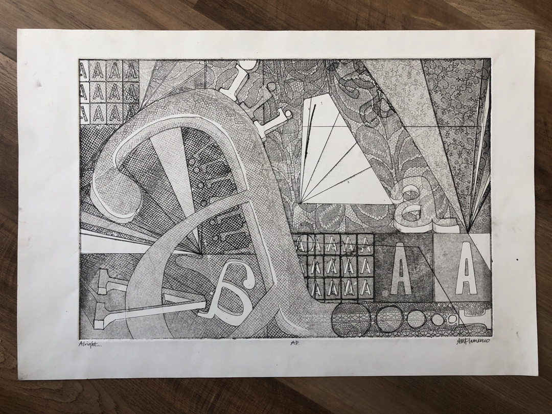 This is the first Artist Proof (A.P.), a one-of-a-kind print, made from the piece titled ‘Alright’, an intaglio etching by AnnMarie Flamenco, circa 2005. Here I was exploring the “I” and “A” letterforms, using lace, stencils, and hand-etching on a steel plate to create an abstract typographic piece.