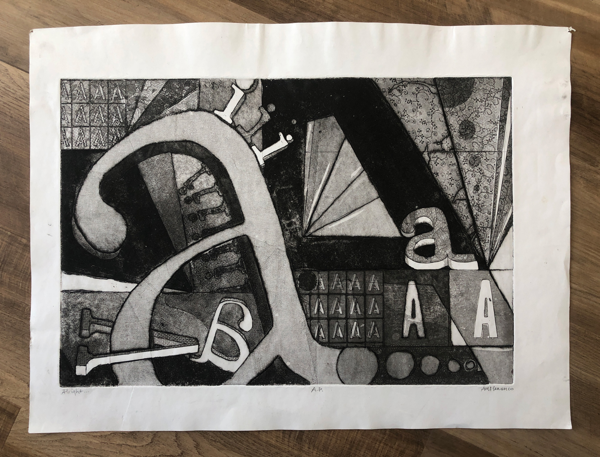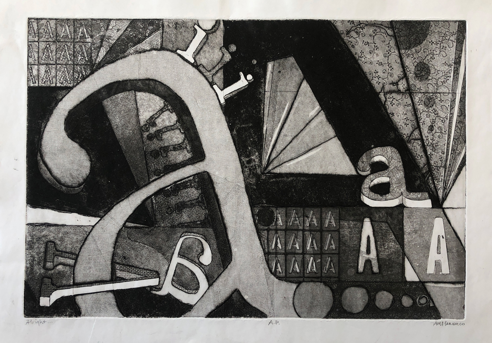 This is the third Artist Proof (A.P.), a one-of-a-kind print made from the piece titled ‘Alright’, an intaglio etching by AnnMarie Flamenco, circa 2005. Here I was exploring the “I” and “A” letterforms, using lace, stencils, and hand-etching on a steel plate to create an abstract typographic piece.