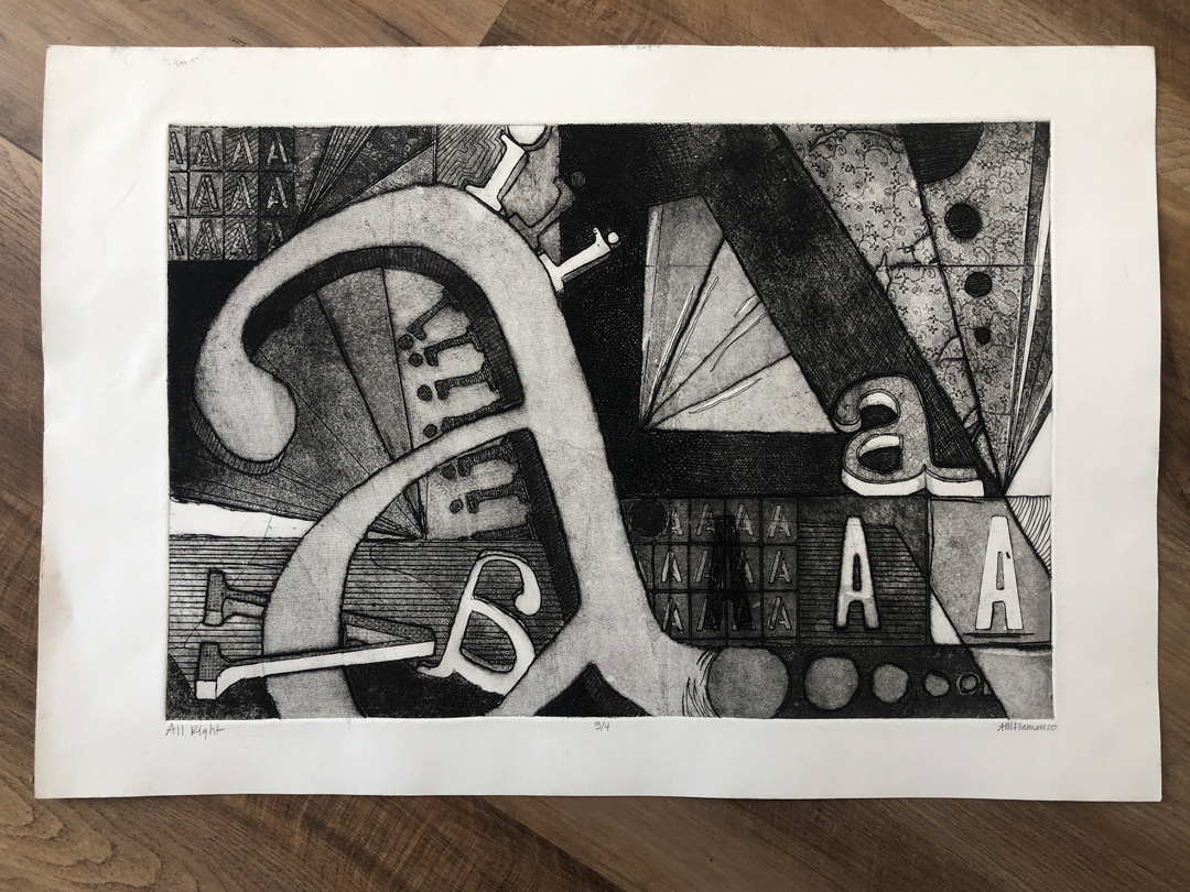 This is the third of four prints made from the piece titled ‘Alright’, an intaglio etching by AnnMarie Flamenco, circa 2005. Here I was exploring the “I” and “A” letterforms, using lace, stencils, and hand-etching on a steel plate to create an abstract typographic piece.